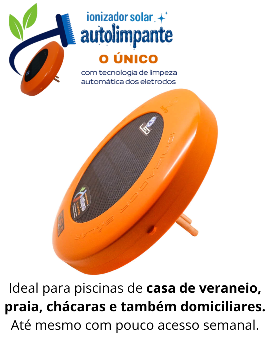 Com o autolimpante, os eletrodos de cobre estarão sempre limpos, contato total com a água, sempre que houver sol estará ionizando. Além do diferencial da limpeza automática dos eletrodos de cobre, o autolimpante contém também o diferencial do LED indicativo de funcionamento.