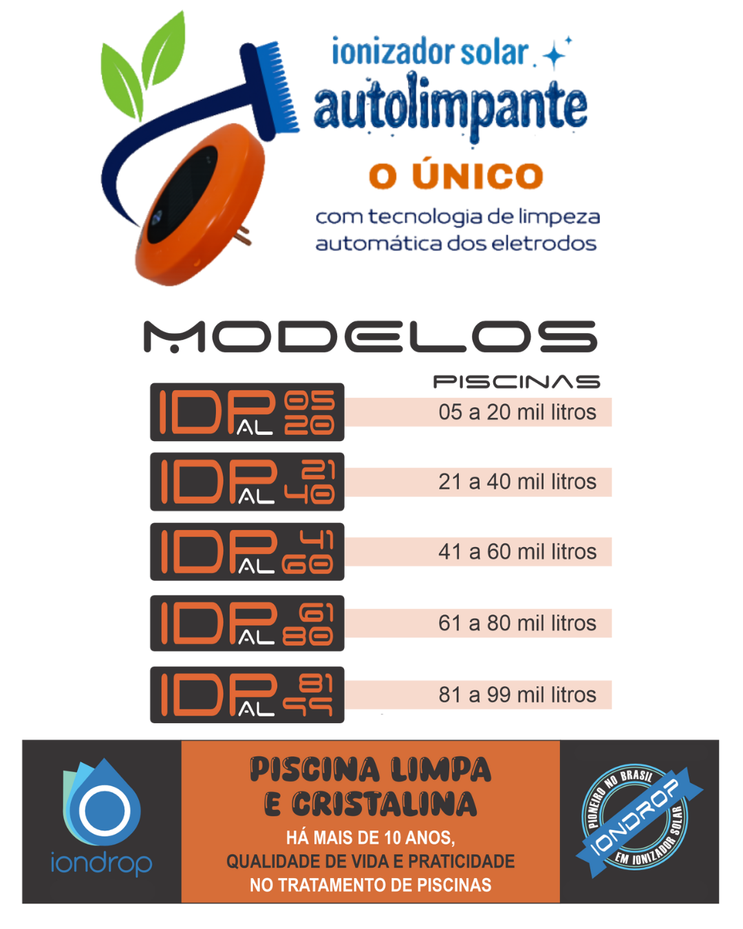 IONDROP, PIONEIRO NO BRASIL EM IONIZADOR SOLAR, quer levar a vocês mais tecnologia e facilidade no tratamento da sua piscina. Alternativa inovadora para clarificar a água da sua piscina garantindo um lazer saudável e redução de até 90% do uso de cloro.